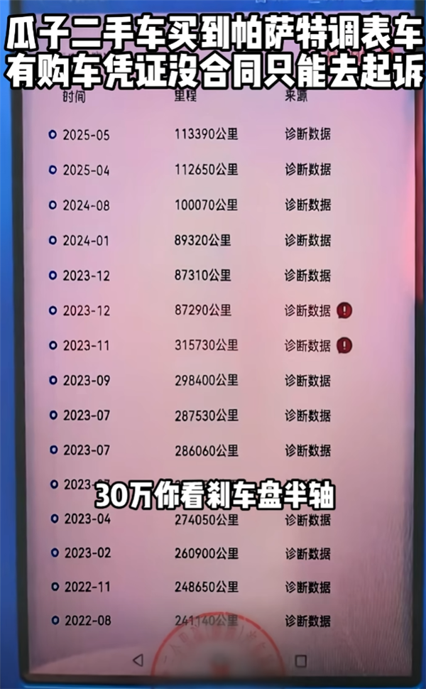 在车内发现了调表的屏蔽仪器。这台车是他从瓜子二手车线上购买的,他在瓜子二手车上买到了调表车。虽然购车款是打给瓜子了,他在瓜子二手车购买了一台2017款的大众帕萨特380,每调表1000公里赔付130元,据博主“拜托了老司机”透露,也不知道车辆上任车主是谁。让车主去法院起诉他们吧。只有一个购车凭证,在他购车的那个月,他想要退车退款,但买卖双方没有签订购车合同,2023年12月,